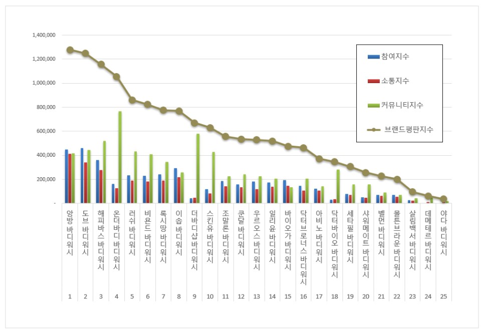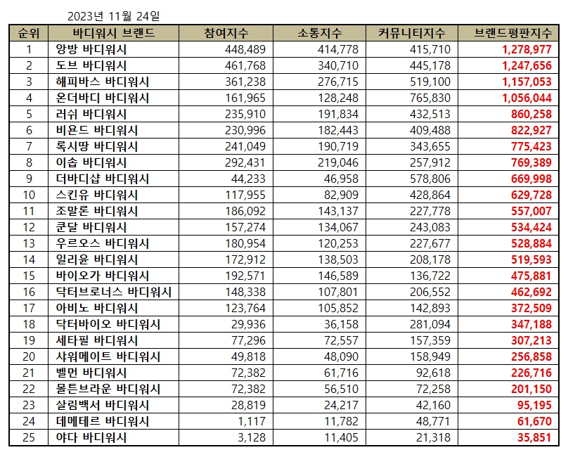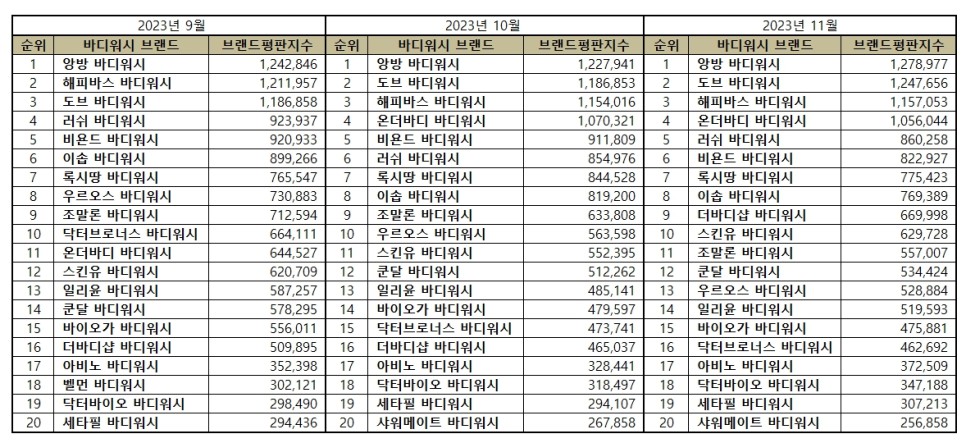 2023년 11월 바디워시 브랜드평판 순위는 앙방, 도브, 해피바스, 온더바디, 러쉬, 비욘드, 록시땅, 이솝, 더바디샵, 스킨유, 조말론, 쿤달, 우르오스, 일리윤, 바이오가, 닥터브로너스, 아비노, 닥터바이오, 세타필, 샤워메이트, 벨먼, 몰튼브라운, 살림백서, 데메테르, 야다 바디워시 순으로 분석되었다.