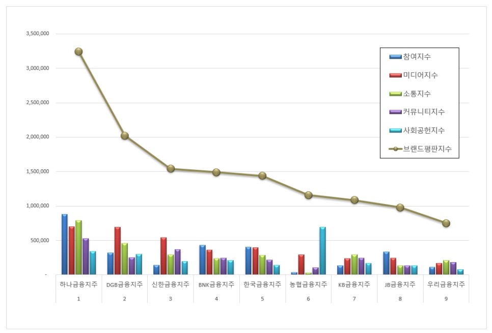 1위, 하나금융지주 브랜드는 참여지수 879,408 미디어지수 701,040 소통지수 792,008 커뮤니티지수 528,411 사회공헌지수 340,624가 되면서 브랜드평판지수 3,241,491로 분석됐다. 지난 10월 브랜드평판지수 3,428,260과 비교해보면 5.45% 하락했다.