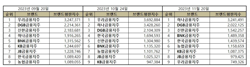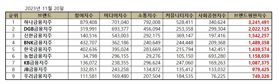 한국기업평판연구소는 2023년 10월 20일부터 2023년 11월 20일까지 금융지주회사 브랜드 빅데이터 13,709,588개를 분석하여 소비자들의 참여와 미디어, 소통, 커뮤니티, 사회공헌, 소비자지표로 금융지주회사 브랜드평판지수를 산출하였다. 지난 10월 금융지주회사 브랜드 빅데이터 16,434,813개와 비교하면 16.58% 줄어들었다.
