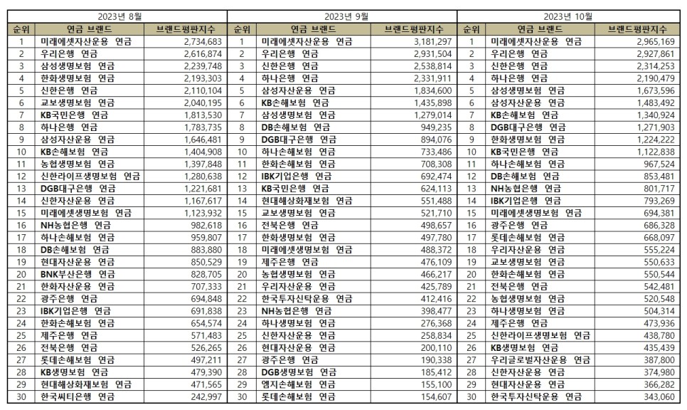 2023년 10월 연금 브랜드평판 30위 순위는 미래에셋자산운용, 우리은행, 신한은행, 하나은행, 삼성생명보험, 삼성자산운용, KB손해보험, DGB대구은행, 한화생명보험, KB국민은행, 하나손해보험, DB손해보험, NH농협은행, IBK기업은행, 미래에셋생명보험, 광주은행, 롯데손해보험, 우리자산운용, 교보생명보험, 한화손해보험, 전북은행, 농협생명보험, 하나생명보험, 제주은행, 신한라이프생명보험, KB생명보험, 우리글로벌자산운용, 신한자산운용, 현대자산운용, 한국투자신탁운용 연금 순으로 나타났다.