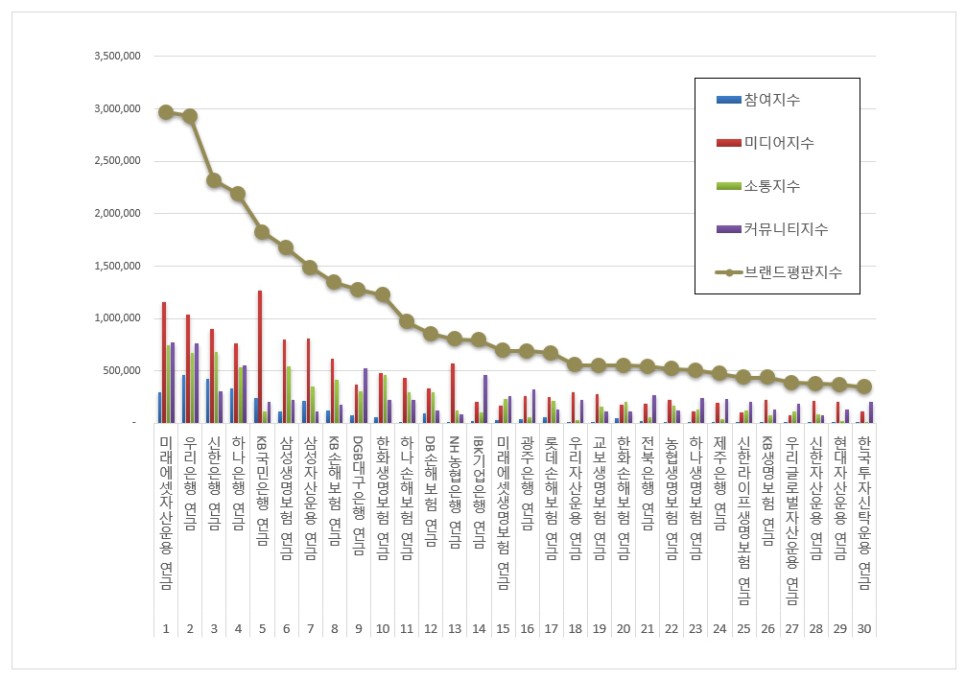 1위, 미래에셋자산운용 연금 브랜드는 참여지수 297,635 미디어지수 1,153,700 소통지수 744,546 커뮤니티지수 769,289가 되면서 브랜드평판지수 2,965,169로 분석됐다. 지난 9월 브랜드평판지수 3,181,297과 비교해보면 6.79% 하락했다.​