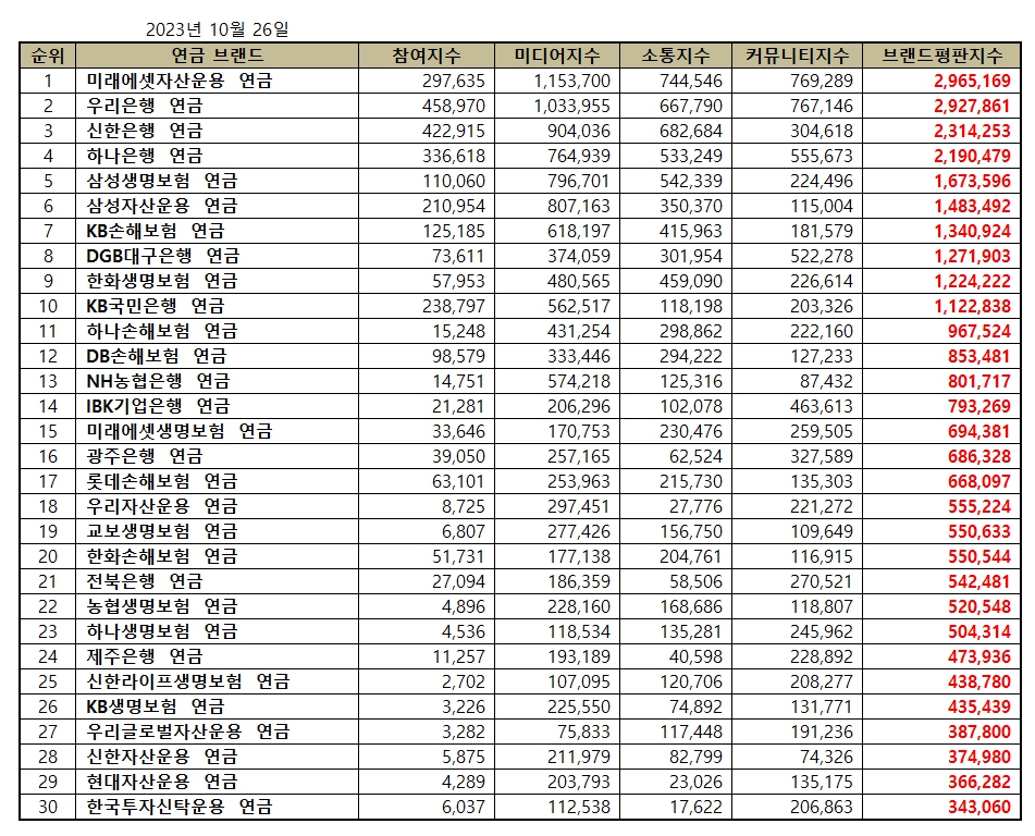 2023년 10월 빅데이터 분석한 연금 브랜드는 미래에셋자산운용, 우리은행, 신한은행, 하나은행, 삼성생명보험, 삼성자산운용, KB손해보험, DGB대구은행, 한화생명보험, KB국민은행, 하나손해보험, DB손해보험, NH농협은행, IBK기업은행, 미래에셋생명보험, 광주은행, 롯데손해보험, 우리자산운용, 교보생명보험, 한화손해보험, 전북은행, 농협생명보험, 하나생명보험, 제주은행, 신한라이프생명보험, KB생명보험, 우리글로벌자산운용, 신한자산운용, 현대자산운용, 한국투자신탁운용 연금이다.