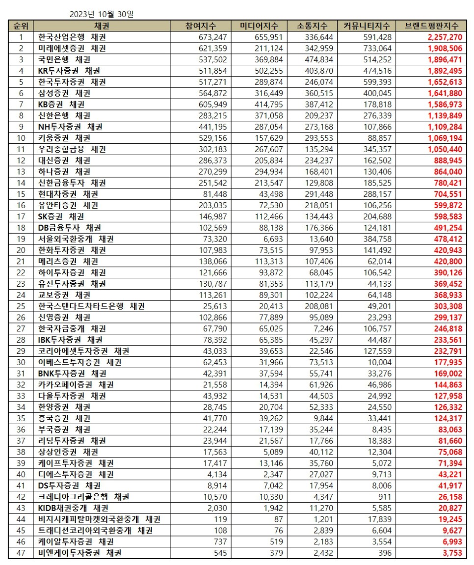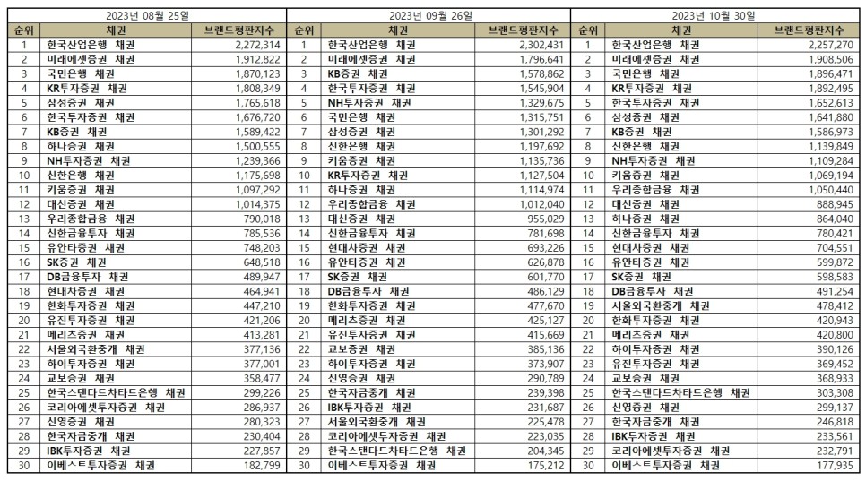 2023년 10월 채권 브랜드평판 30위 순위는 한국산업은행, 미래에셋증권, 국민은행, KR투자증권, 한국투자증권, 삼성증권, KB증권, 신한은행, NH투자증권, 키움증권, 우리종합금융, 대신증권, 하나증권, 신한금융투자, 현대차증권, 유안타증권, SK증권, DB금융투자, 서울외국환중개, 한화투자증권, 메리츠증권, 하이투자증권, 유진투자증권, 교보증권, 한국스탠다드차타드은행, 신영증권, 한국자금중개, IBK투자증권, 코리아에셋투자증권, 이베스트투자증권 채권 순으로 나타났다.