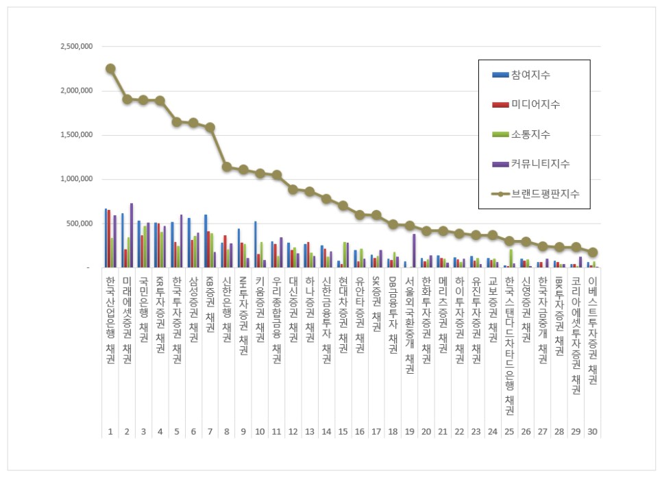 1위, 한국산업은행 채권 브랜드는 참여지수 673,247 미디어지수 655,951 소통지수 336,644 커뮤니티지수 591,428이 되면서 브랜드평판지수 2,257,270으로 분석됐다. 지난 9월 브랜드평판지수 2,302,431과 비교해보면 1.96% 하락했다.