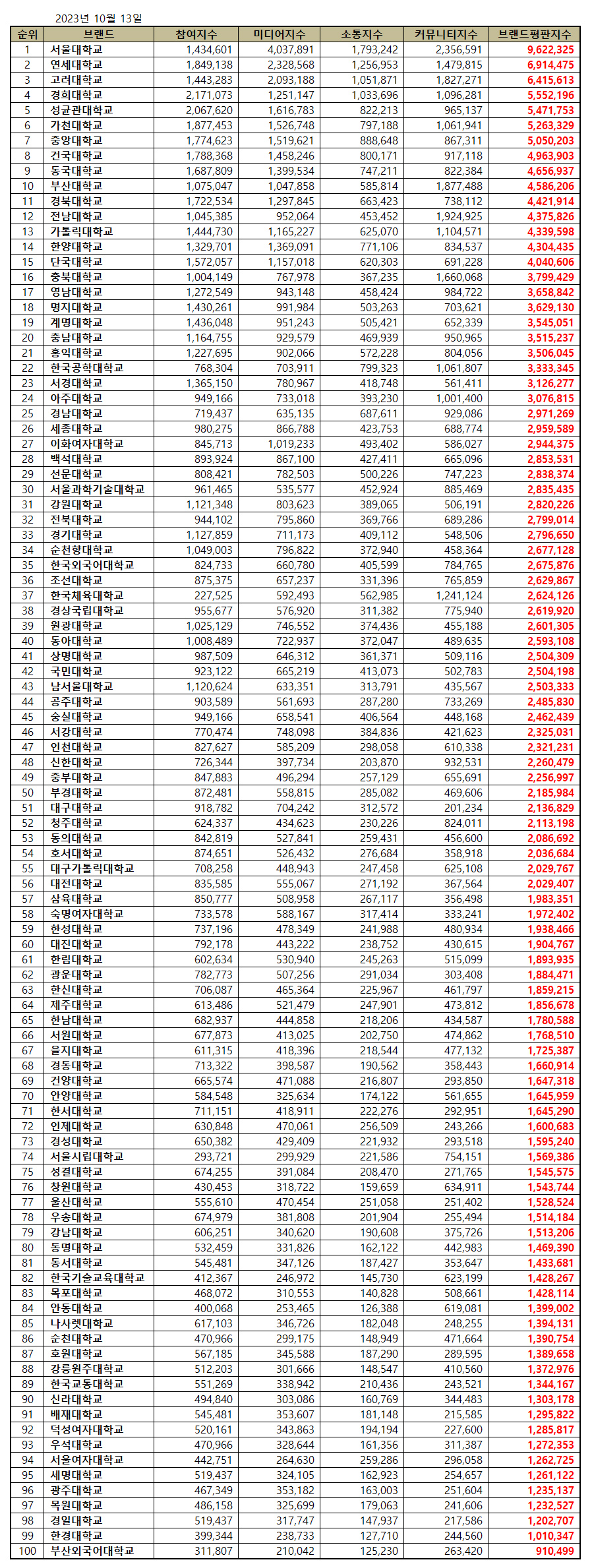 2023년 10월 대학교 브랜드평판 30위 순위는 서울대학교, 연세대학교, 고려대학교, 경희대학교, 성균관대학교, 가천대학교, 중앙대학교, 건국대학교, 동국대학교, 부산대학교, 경북대학교, 전남대학교, 가톨릭대학교, 한양대학교, 단국대학교, 충북대학교, 영남대학교, 명지대학교, 계명대학교, 충남대학교, 홍익대학교, 한국공학대학교, 서경대학교, 아주대학교, 경남대학교, 세종대학교, 이화여자대학교, 백석대학교, 선문대학교, 서울과학기술대학교 순으로 분석되었다.
