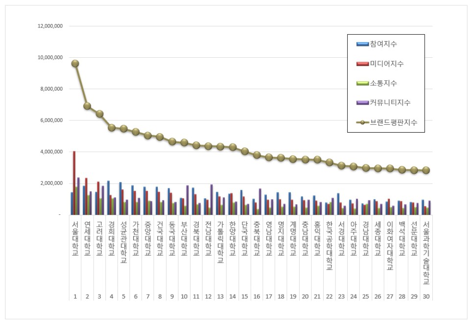 1위, 서울대학교 브랜드는 참여지수 1,434,601 미디어지수 4,037,891 소통지수 1,793,242 커뮤니티지수 2,356,591이 되면서 브랜드평판지수 9,622,325로 분석됐다. 지난 9월 브랜드평판지수 7,005,087과 비교해보면 37.36% 상승했다.