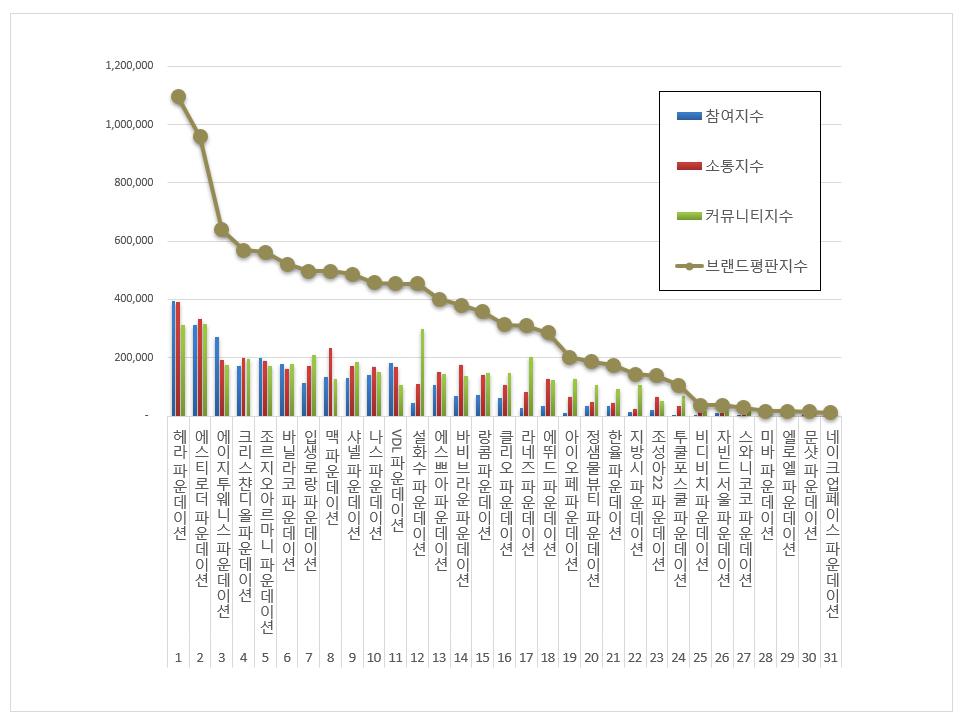 브랜드에 대한 평판은 브랜드에 대한 소비자들의 활동 빅데이터를 참여가치, 소통가치, 소셜가치, 시장가치, 재무가치로 나누게 된다. 파운데이션 브랜드평판지수는 참여지수, 소통지수, 커뮤니티지수로 분석하였다.