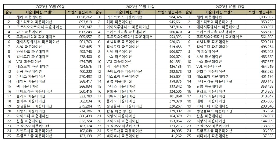 한국기업평판연구소 ( http://www.brikorea.com소장 구창환 ) 는 국내 브랜드의 평판지수를 매달 측정하여 브랜드 평판지수의 변화량을 발표하고 있다. 이번 파운데이션 브랜드 평판지수는 2023년 9월 13일부터 2023년 10월 13일까지의 브랜드 빅데이터 분석 결과이다.