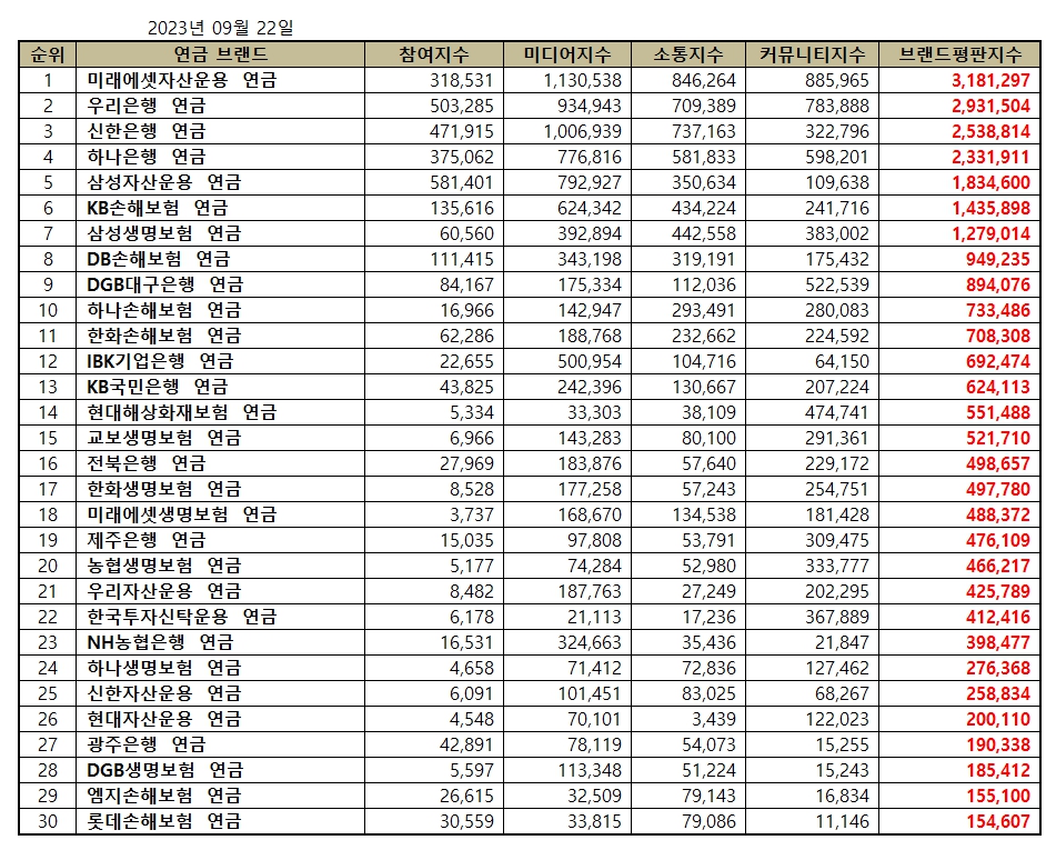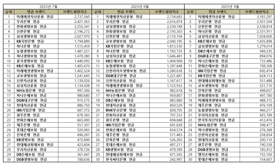 2023년 9월 연금 브랜드평판 30위 순위는 미래에셋자산운용, 우리은행, 신한은행, 하나은행, 삼성자산운용, KB손해보험, 삼성생명보험, DB손해보험, DGB대구은행, 하나손해보험, 한화손해보험, IBK기업은행, KB국민은행, 현대해상화재보험, 교보생명보험, 전북은행, 한화생명보험, 미래에셋생명보험, 제주은행, 농협생명보험, 우리자산운용, 한국투자신탁운용, NH농협은행, 하나생명보험, 신한자산운용, 현대자산운용, 광주은행, DGB생명보험, 엠지손해보험, 롯데손해보험 연금 순으로 나타났다.