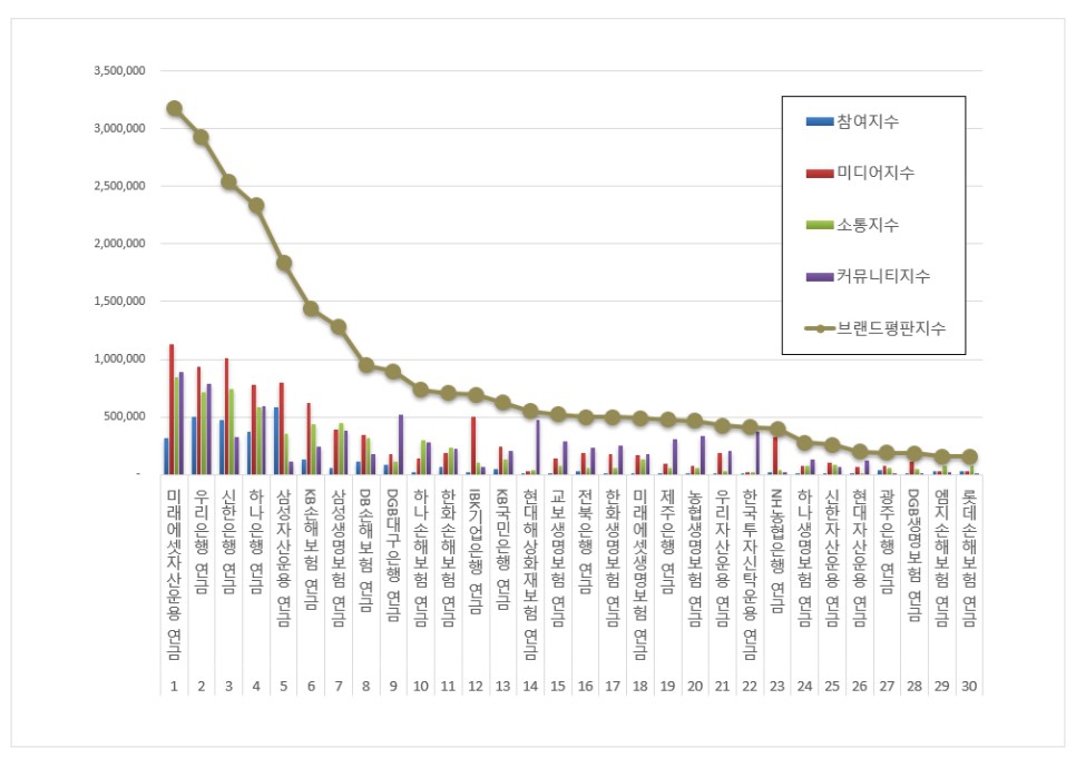 1위, 미래에셋자산운용 연금 브랜드는 참여지수 318,531 미디어지수 1,130,538 소통지수 846,264 커뮤니티지수 885,965가 되면서 브랜드평판지수 3,181,297로 분석됐다. 지난 8월 브랜드평판지수 2,734,683과 비교해보면 16.33% 상승했다.