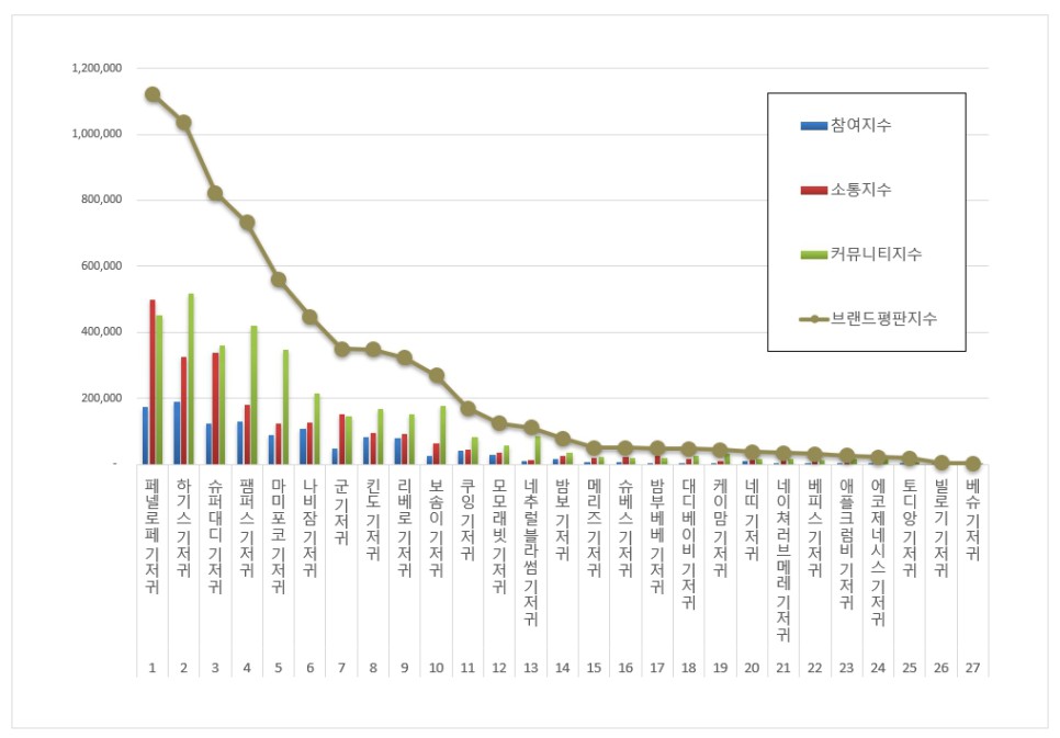 1위, 페넬로페 기저귀 브랜드는 참여지수 174,538 소통지수 497,511 커뮤니티지수 450,405가 되면서 브랜드평판지수 1,122,454로 분석됐다. 지난 8월 브랜드평판지수 1,086,554와 비교해보면 3.30% 상승했다.​