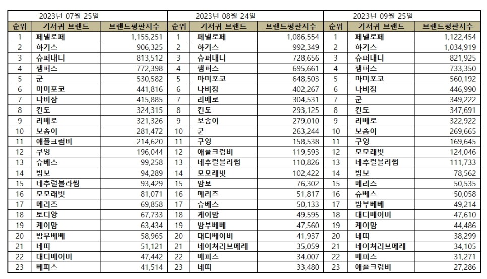 2023년 9월 기저귀 브랜드평판 빅데이터 분석 순위는 페넬로페, 하기스, 슈퍼대디, 팸퍼스, 마미포코, 나비잠, 군, 킨도, 리베로, 보솜이, 쿠잉, 모모래빗, 네추럴블라썸, 밤보, 메리즈, 슈베스, 밤부베베, 대디베이비, 케이맘, 네띠, 네이쳐러브메레, 베피스, 애플크럼비, 에코제네시스, 토디앙, 빌로기, 베슈 기저귀 순으로 분석되었다.