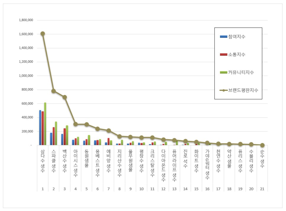 1위, 삼다수 생수 브랜드는 참여지수 506,268 소통지수 488,009 커뮤니티지수 615,661이 되면서 브랜드평판지수 1,609,938로 분석됐다. 지난 8월 브랜드평판지수 1,640,501과 비교해보면 1.86% 하락했다.​