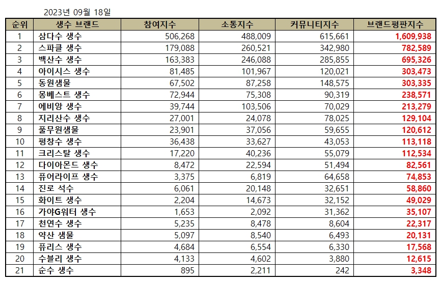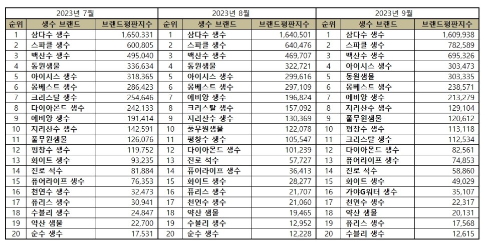 2023년 9월 생수 브랜드평판 순위는 삼다수 생수, 스파클 생수, 백산수 생수, 아이시스 생수, 동원샘물, 몽베스트 생수, 에비앙 생수, 지리산수 생수, 풀무원샘물, 평창수 생수, 크리스탈 생수, 다이아몬드 생수, 퓨어라이프 생수, 진로 석수, 화이트 생수, 가야G워터 생수, 천연수 생수, 약산 샘물, 퓨리스 생수, 수블리 생수, 순수 생수 순이었다.