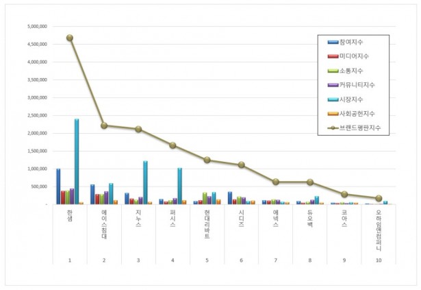 1위, 한샘 브랜드는 참여지수 1,006,070 미디어지수 374,483 소통지수 395,472 커뮤니티지수 453,176 시장지수 2,403,501 사회공헌지수 57,797이 되면서 브랜드평판지수 4,690,499로 분석됐다. 지난 12월 브랜드평판지수 5,079,247과 비교해보면 7.65% 하락했다.