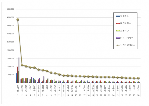 1위, 송대관 브랜드는 참여지수 592,167 미디어지수 997,771 소통지수 726,937 커뮤니티지수 1,553,244가 되면서 브랜드평판지수 3,870,119로 분석됐다. 지난 1월 브랜드평판지수 176,062와 비교해보면 2,098.15% 상승했다.