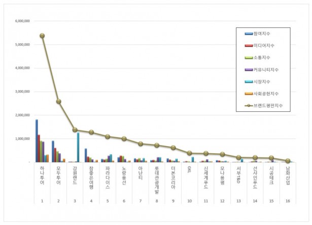 1위, 하나투어 브랜드는 참여지수 1,810,272 미디어지수 1,162,891 소통지수 907,928 커뮤니티지수 878,046 시장지수 299,324 사회공헌지수 326,837이 되면서 브랜드평판지수 5,385,297로 분석됐다. 지난 3월 브랜드평판지수 4,837,787과 비교해보면 11.32% 상승했다.