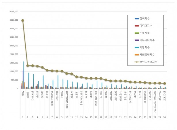 1위, 영풍 브랜드는 참여지수 182,614 미디어지수 309,855 소통지수 464,541 커뮤니티지수 1,074,735 시장지수 1,583,912 사회공헌지수 367,180이 되면서 브랜드평판지수 3,982,838로 분석됐다. 지난 3월 브랜드평판지수 3,390,308과 비교해보면 17.48% 상승했다.