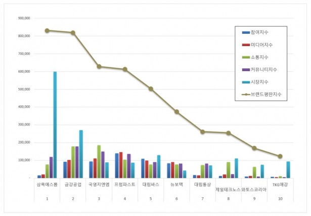 5위, 대림바스 브랜드는 참여지수 108,282 미디어지수 98,372 소통지수 76,677 커뮤니티지수 90,907 시장지수 129,750이 되면서 브랜드평판지수 503,989로 분석됐다. 지난 4월 브랜드평판지수 173,992와 비교해보면 189.66% 상승했다.