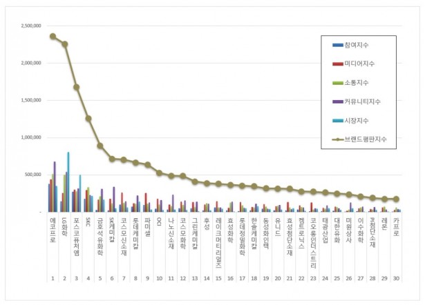 2위, LG화학 브랜드는 참여지수 147,898 미디어지수 259,104 소통지수 500,631 커뮤니티지수 541,277 시장지수 808,520이 되면서 브랜드평판지수 2,257,431로 분석됐다. 지난 5월 브랜드평판지수 2,303,314와 비교해보면 1.99% 하락했다.