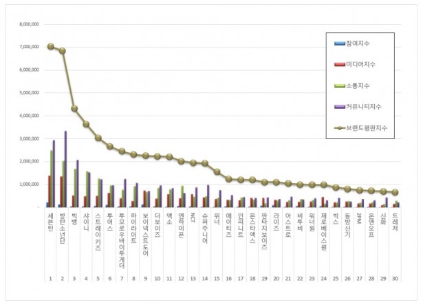 2025년 6월 보이그룹 브랜드평판 30위 순위는 세븐틴, 방탄소년단, 빅뱅, 샤이니, 스트레이 키즈, 투어스, 투모로우바이투게더, 하이라이트, 보이넥스트도어, 더보이즈, 엑소, 엔하이픈, NCT, 슈퍼주니어, 위너, 에이티즈, 인피니트, 몬스타엑스, 판타지보이즈, 라이즈 , 아스트로, 비투비, 워너원, 제로베이스원, 빅스, 동방신기, 2PM, 온앤오프, 신화, 트레저 순으로 분석되었다.