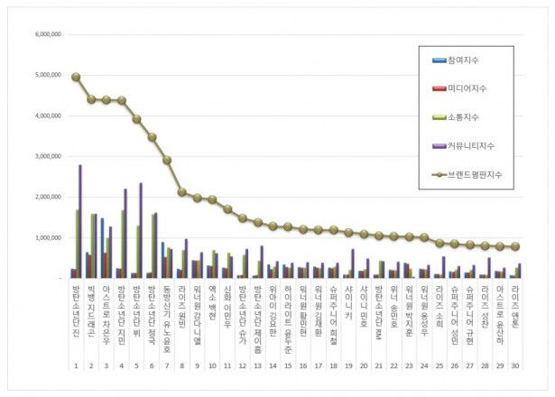 5위, 방탄소년단 뷔 브랜드는 참여지수 137,060 미디어지수 140,424 소통지수 1,302,810 커뮤니티지수 2,346,369가 되면서 브랜드평판지수 3,926,662로 분석됐다. 지난 7월 브랜드평판지수 2,883,333과 비교해보면 36.18% 상승했다.